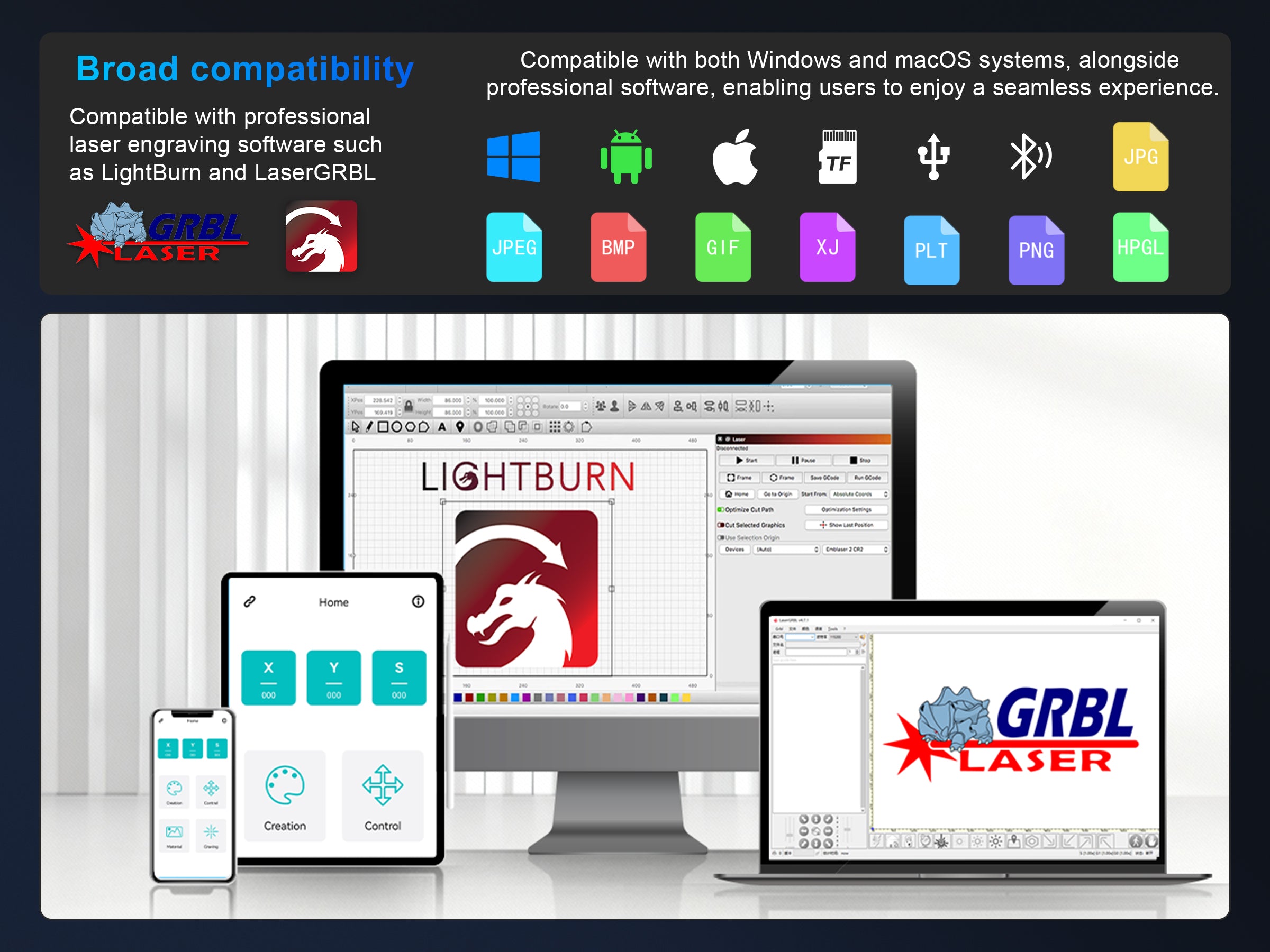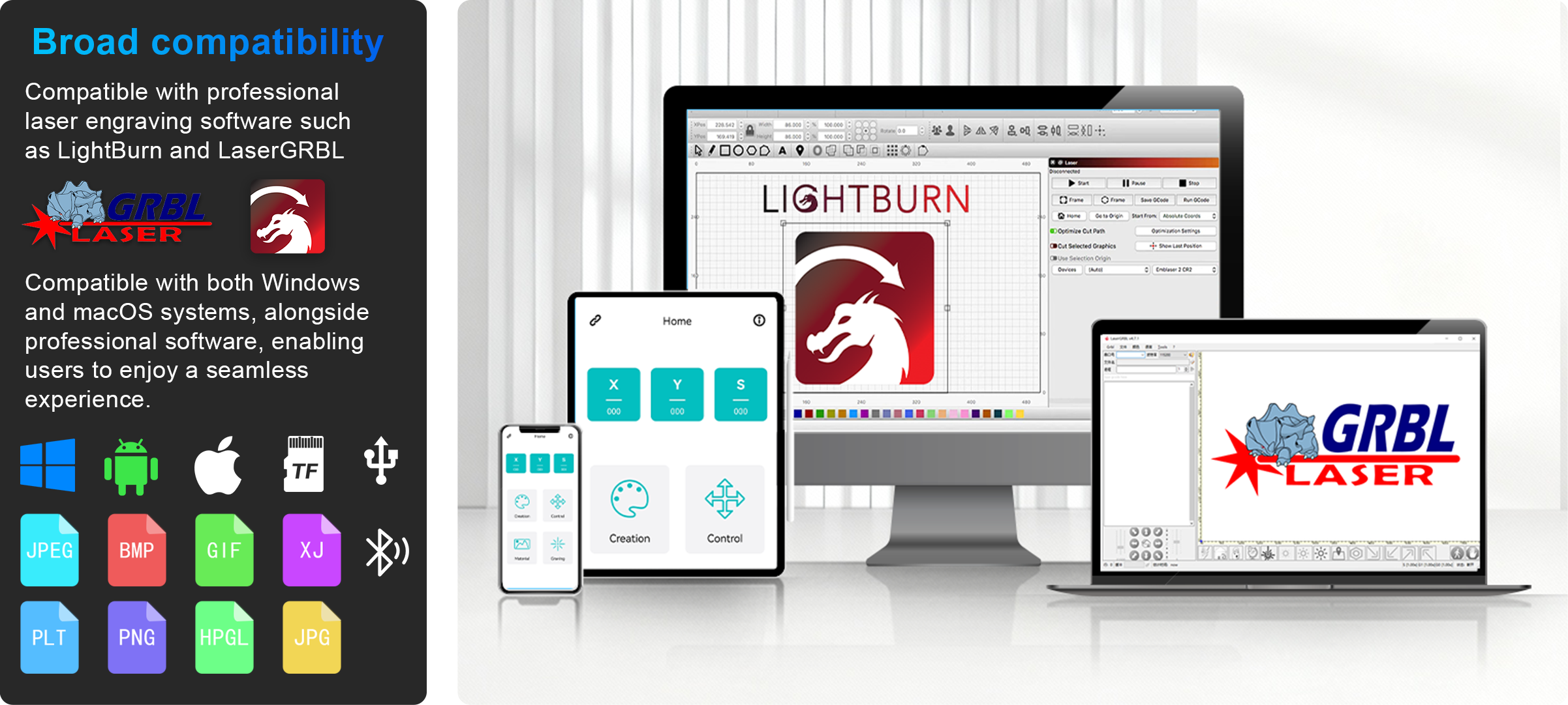Compatible with professional laser engraving software such as LightBurn and LaserGRBL